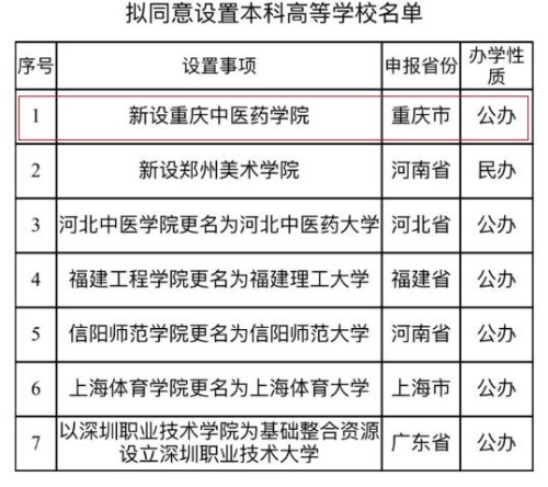 近日,教育部公示了拟同意设置7所本科高等学校(公示已结束),公示信息显示,教育部拟同意新设重庆中医药学院,办学性质为公办。