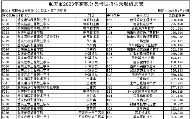 重庆教育考试院公布了关于2023年高职分类考试专科批第三次征集招生录取信息,以下是2023高职分类专科批——对口类第三次征集招生录取信息表: