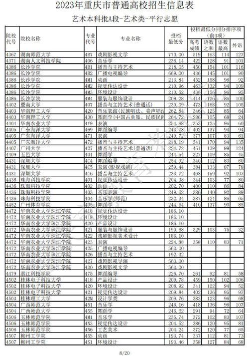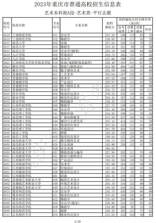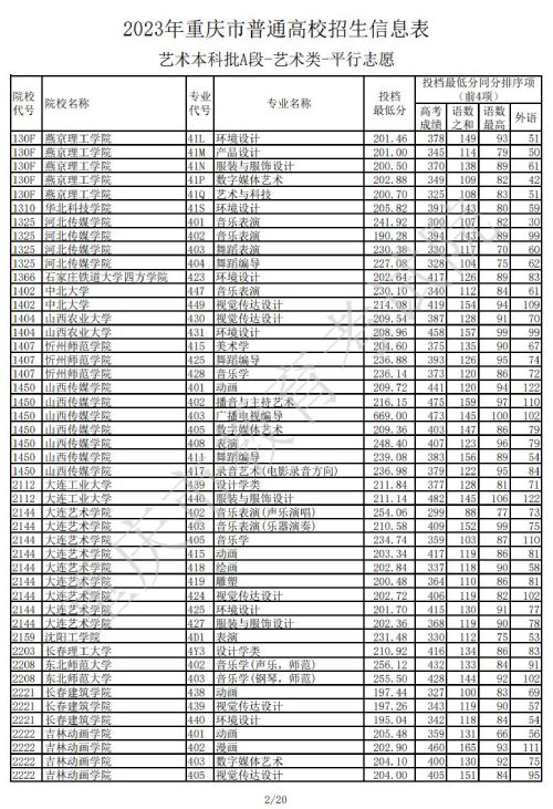2023年重庆普通高校招生信息表艺术本科批A段(艺术类)平行志愿(一)