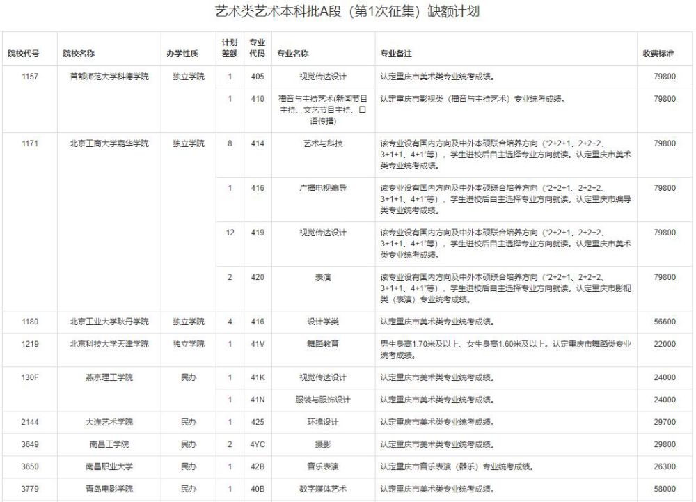2023年重庆艺术类艺术本科批A段第1次征集志愿缺额计划公布