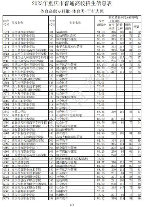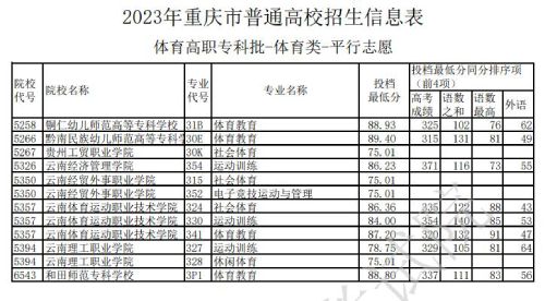 重庆市教育考试院发布关于2023年普通高校招生信息表-体育高职专科批-体育类-平行志愿信息,具体情况如下: