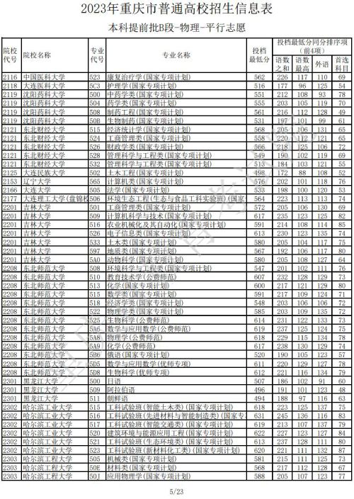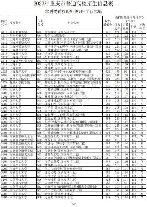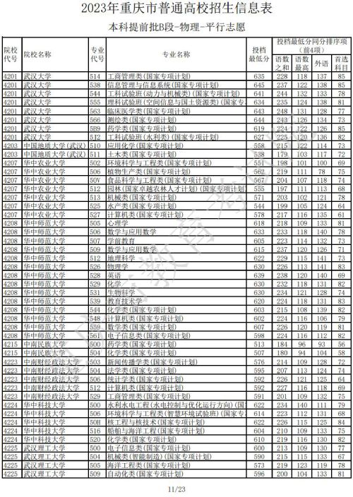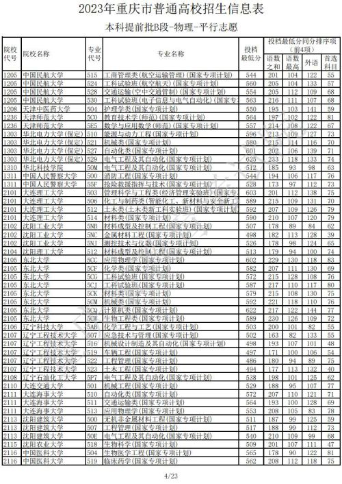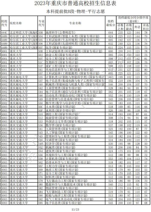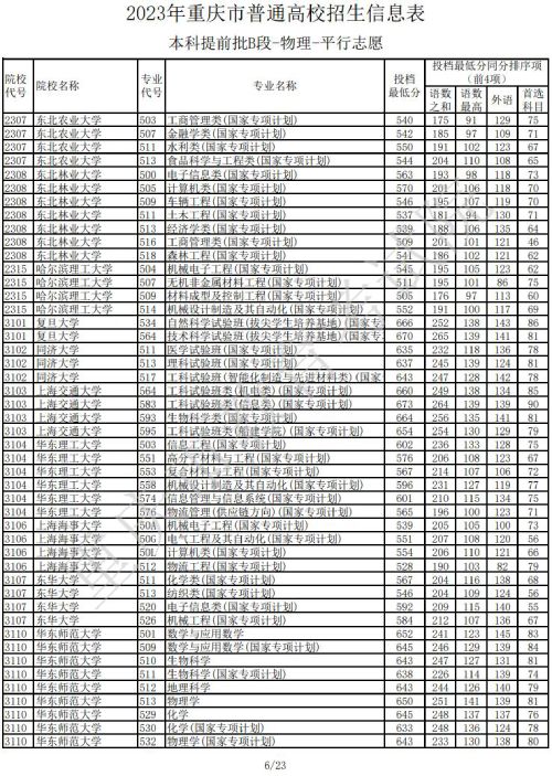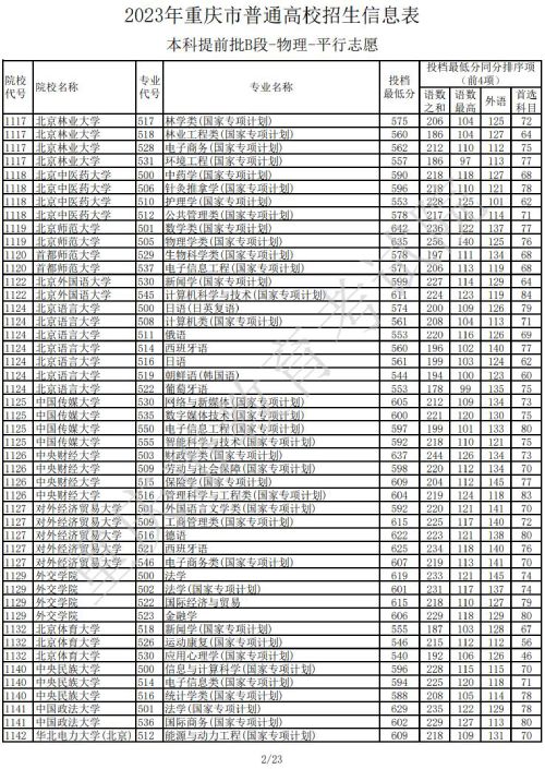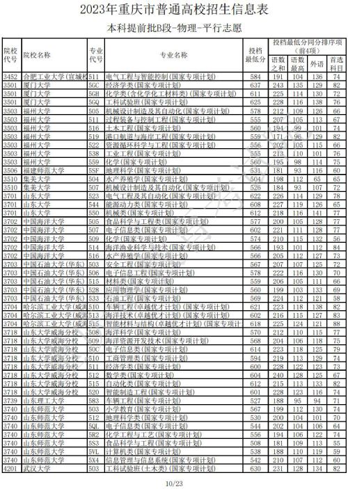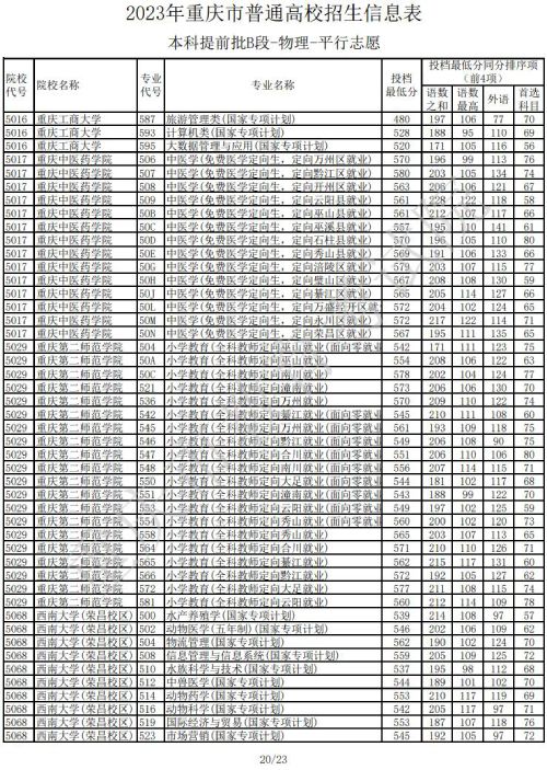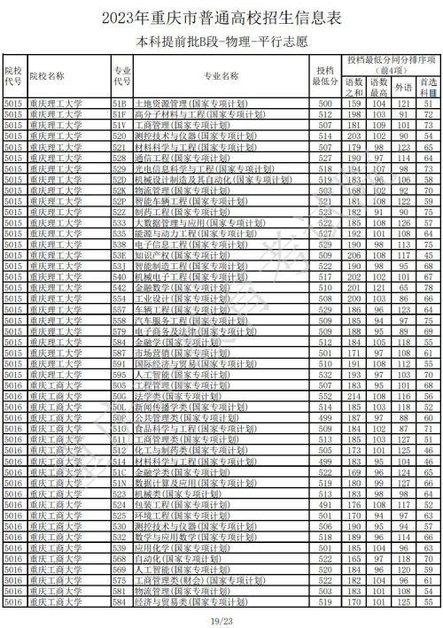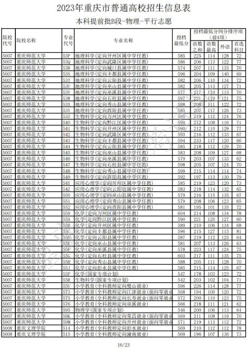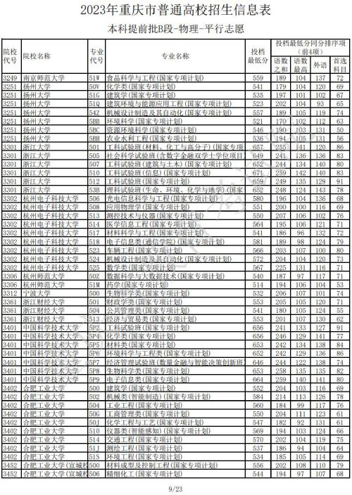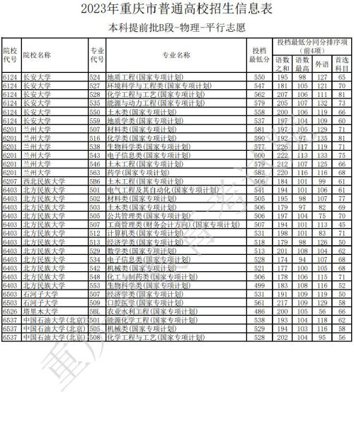2023年重庆普通类本科提前批B段(物理)平行志愿招生信息表