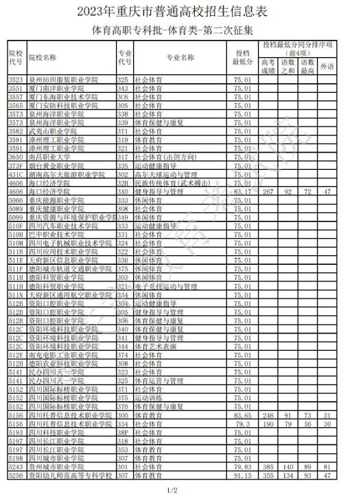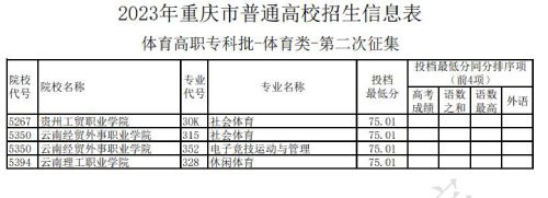 2023年重庆体育高职专科批第二次征集招生信息表发布时间:2023/7/25 10:28:05 | 人感兴趣 | 评分:3