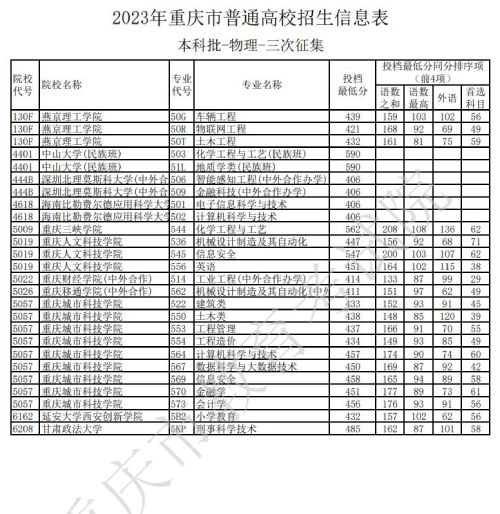 2023年重庆普通高校招生信息本科批(物理类)第三次征集公布