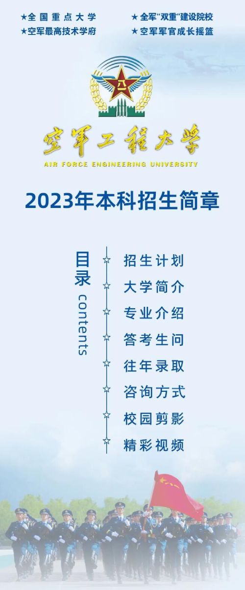 经教育部和军委机关批准,空军工程大学2023年在全国30个省(直辖市、自治区)面向普通高中毕业生招收2010名生长军官本科学员(男生1971人、女生39人),较2022年增加445人,增加比例近30%,欢迎广大考生报考。