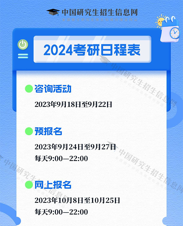 据中国研究生招生信息网发布的消息,2024年去全国硕士生考试初试时间定于2023年12月23日至24日,网上报名时间安排在2023年10月8日至24日,研究生考试预报名时间安排在本月24日起开始。具体考研时间安排如下: