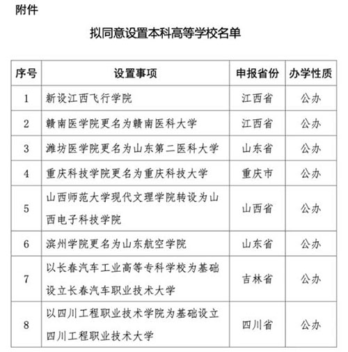 据教育部网站消息,根据《中华人民共和国高等教育法》《普通高等学校设置暂行条例》《普通本科学院设置暂行规定》《本科层次职业学校设置标准(试行)》有关规定及第八届全国高等学校设置评议委员会考察评议结果,经教育部党组会议审议,拟同意设置江西飞行学院等8所学校。