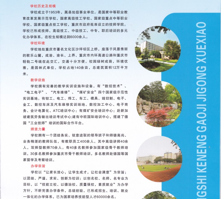 重庆科能高级技工学校成立于1953年,属县处级事业单位。是国家中等职业教育改革发展示范学校、国家高级技工学校、国家级重点中等职业学校、国家级重点技工学校,重庆市政府批准设立的技师学院。