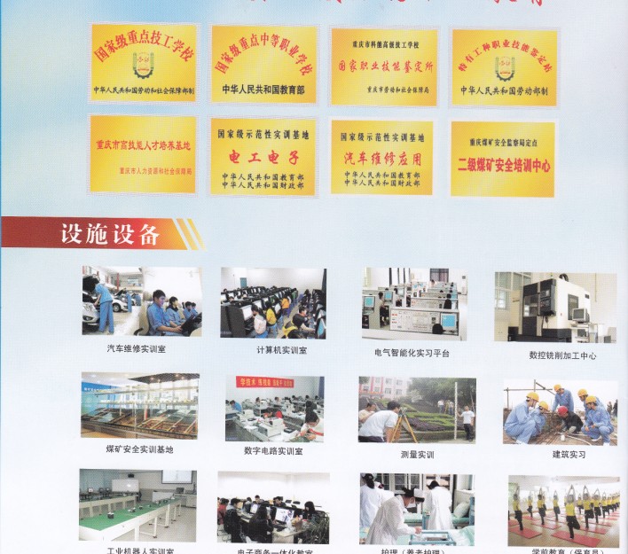 学校拥有完善的教学实训设施和设备,有“数控技术”、“电工电子”、“汽车维修”、“煤矿安全”四个国家级示范性实训基地。我校根据国家教育部、人社部、财政部的批复,成为国家中等职业教育改革发展示范建设学校。