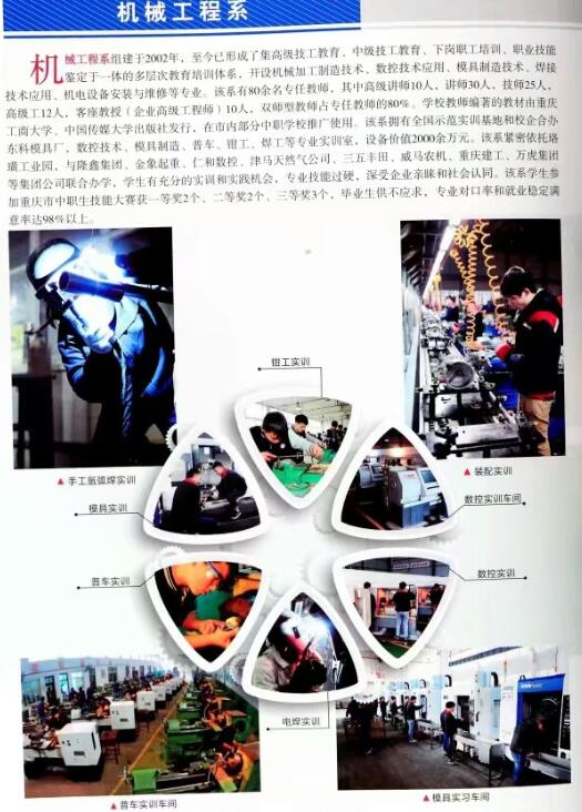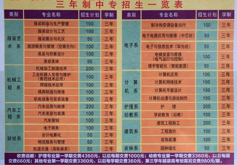 主要专业:护理系(“护理、药剂”)、幼教系(“学前教育、幼师)”、财经系(农村经济综合管理、会计电算化”)、建筑系(“建筑工程施工”)、汽车工程系(“汽车应用与维修、轨道交通运营管理”)、电子信息系(“电梯安装与维修、制冷和空调设备运行”)服装系(“服装设计与工艺、服装制作与生产管理”)、服装展示与礼仪”)、财经系(“农村经济综合管理、会计电算化”)、机械工程系(“机械加工制造技术、数控技术应用、焊接技术应用、农业机械使用与维护”)、综合类(“电子旅游服务与管理、美发育形象设计、工艺美术、现代园艺、畜牧兽医、水产养殖、纸浆再造纸工业)”电子信息系(“制冷与空调设备运行、电子电器应用与维修、电子与信息技术、电梯安装与维修”)计算机系(“计算机应用、计算机网络技术、计算机平面设计、计算机动漫与游戏制作”)(下有详细说明,点击图片可查看清晰大图)