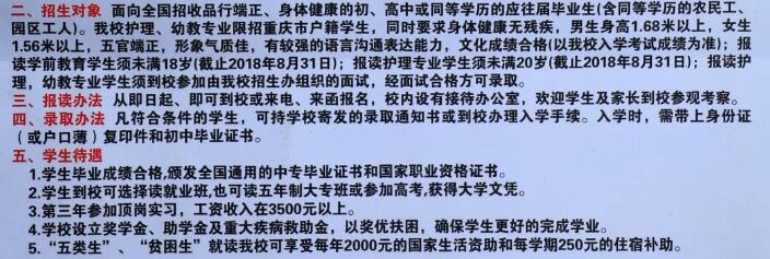 招生对象:面向全国招收品行合格、身体健康的初、高中或同等学历的应、往届毕业生(含同等学历的农民工、园区工人) 。我校护理、幼教专业限重庆市户籍学生,同时要求身体健康无残疾,男生身高168cm以上,女生身高156cm以上。五官端正、形象气质佳,有较强的语言沟通表达能力,文化成绩合格(以我校入学考试成绩为准);报读学前教育学生须未满18周岁;报读护理专业学生须未满20周岁。