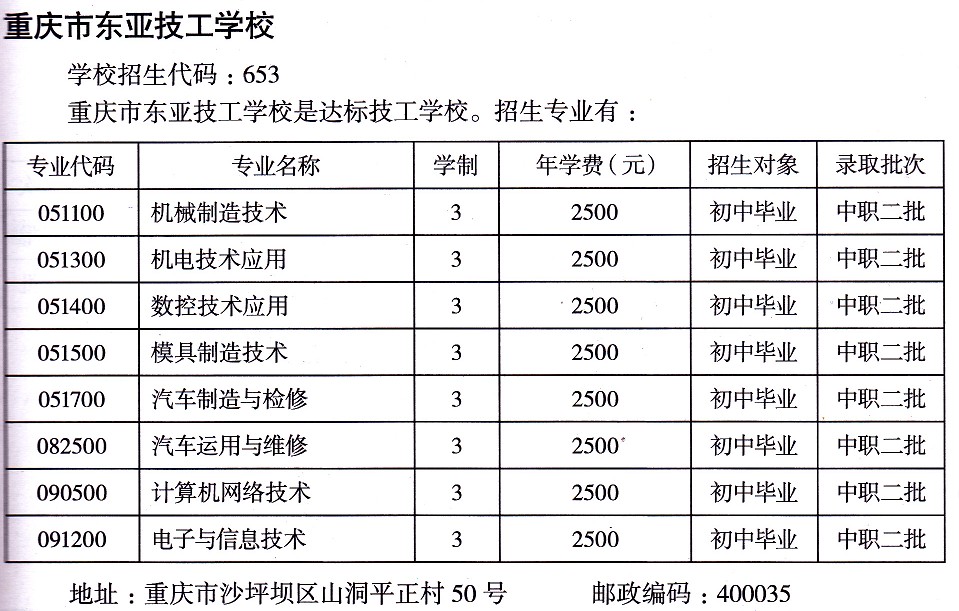 重庆市东亚技工学校经重庆市劳动社会保障局批准成立。重庆市东亚技工学校是重庆市教委批准成立的一所培养机电、建筑、IT、综合管理技术人才的高等教育机构。学校成立于1985年,具有悠久的办学历史。
