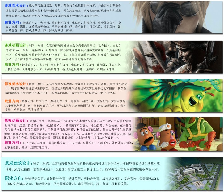 职业方向:影视公司、电视台、数码制作公司、广告公司、网站等行业,从事角色动画设计师、建模设计师、贴图师、影视角色师、影视场景设计师、影视道具设计师、后期合成师等。