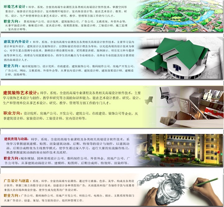 职业方向:在各类景观设计公司、展览设计公司、建筑设计公司、工艺美术设计公司从事室内设计师、景观设计师、展示设计师、效果图设计师、施工图制作员等。