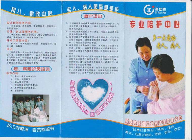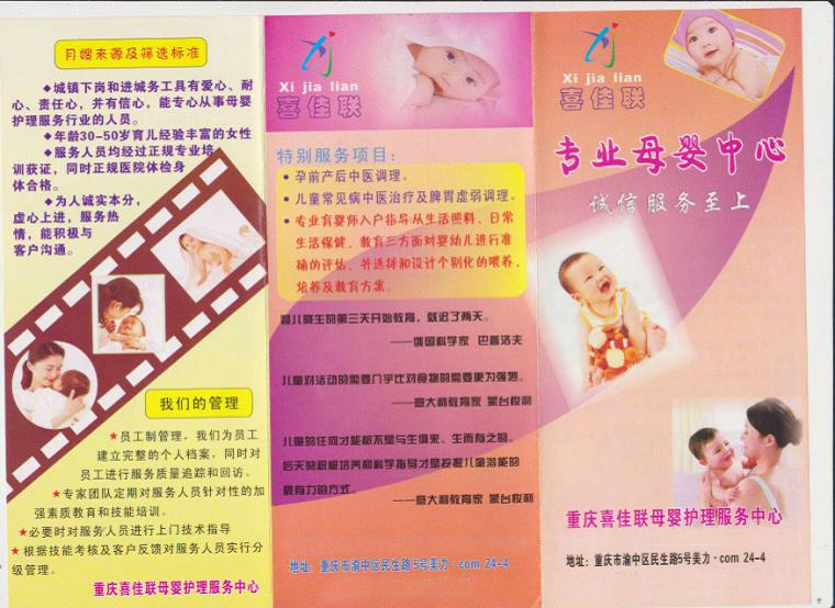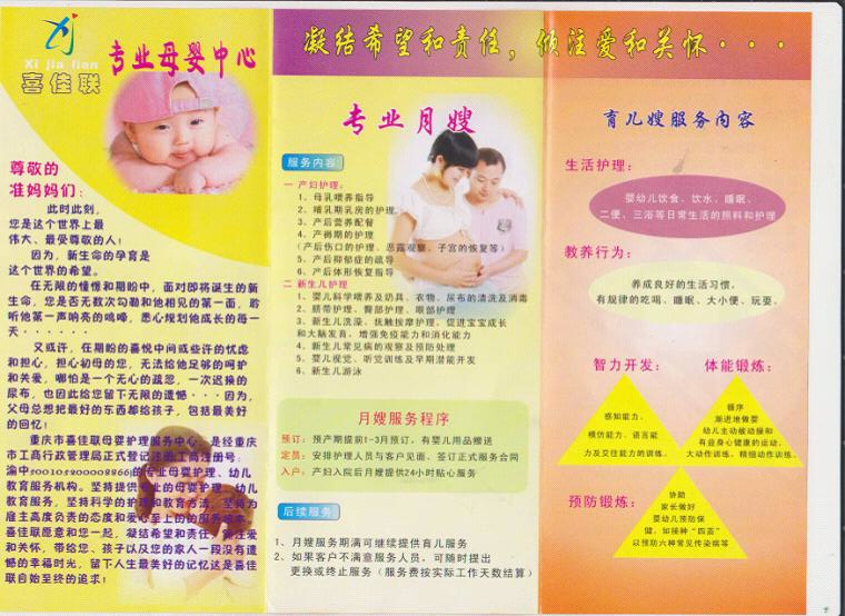 重庆市喜佳联母婴护理服务中心,是经重庆市工商行政管理局正式登记注册(工商注册号:渝中500105200008866)的专业化家庭服务机构,是重庆市家政协会会员单位,是96980家政平台推荐服务企业,主要提供母婴护理(月嫂)、育儿嫂、家政服务(住家或不住家保姆、钟点工、老人陪护)、医院病人陪护、高级管家等服务项目。管理人员中有资深的母婴护理专家顾问、护理专业毕业的专业人员,本科学历2人、大专学历2人以及数百名热爱护理工作、极具爱心、耐心、责任心的长期从事家政服务、母婴护理、老病陪护工作的有丰富经验的下岗工人及进城务工人员。