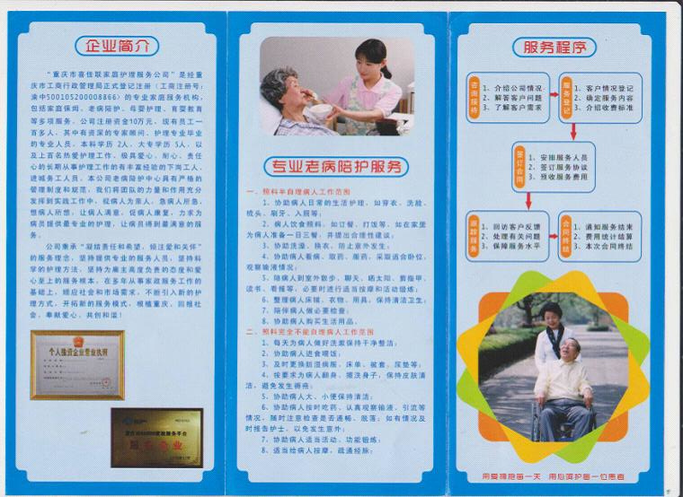中心本着“以人为本、服务社会、倡导科学、追求卓越”的经营理念,以“急客户所急、想客户所需”为公司首要服务理念,以“规范专业、诚信负责、客户至上、服务第一”为服务宗旨,发扬“团结、敬业、求实、创新”的企业精神,坚持为雇主高度负责的态度和爱心至上的服务根本,在多年专业从事母婴护理、医院病人护理的基础上,不断引入新的护理方式,开发新的服务模式,致力于创造一个最专业,最温馨,最诚信的家庭多元化服务机构以满足广大客户的多元需求,根植重庆、回报社会、奉献爱心、共创和谐!