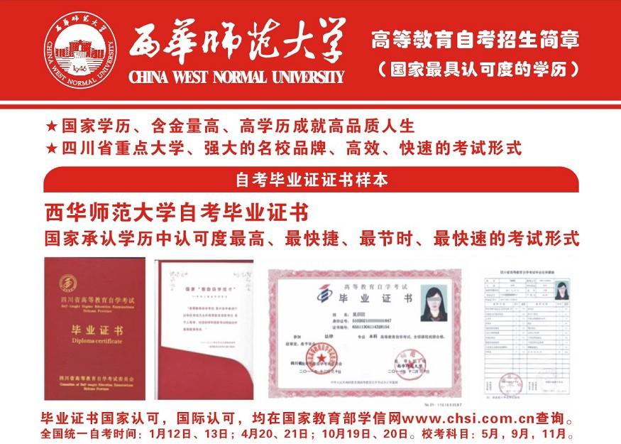 西华师范大学自考,重庆报名,只需每三个月一次周末参加考试,最快一年半拿证,大专可同时套读本科。协议报名,承诺毕业,拿不到国家学历,全款退费。学历国家承认,可考公务员。
