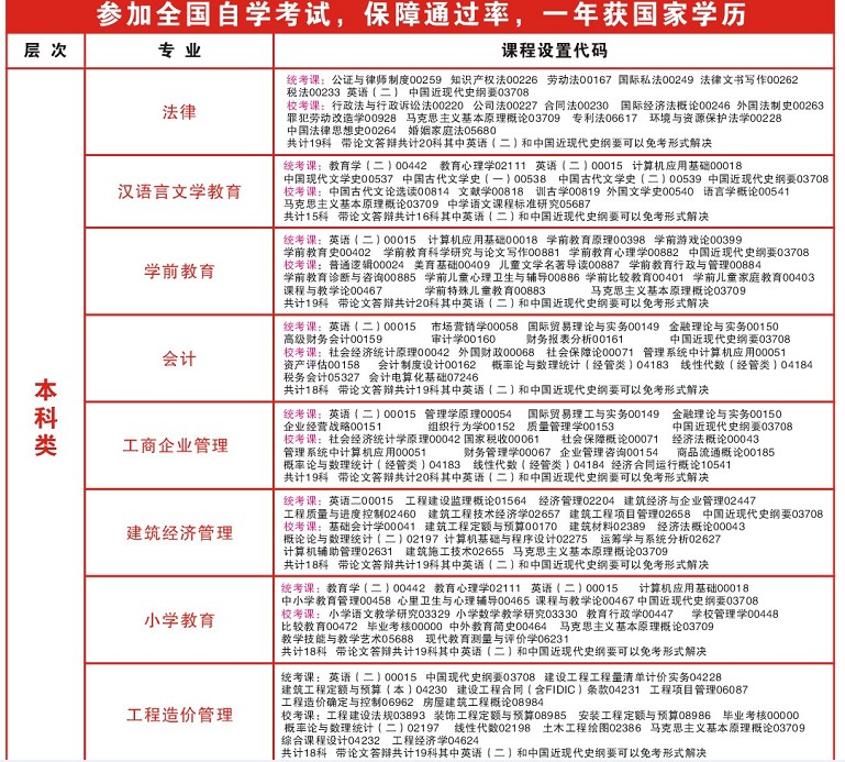 本科类:法律、汉语言文学、学前教育、会计、工商企业管理、建筑经济管理、小学教育、工程造价管理。