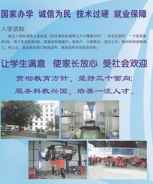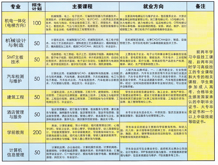 招生专业:机电一体化(电梯方向)、机械设计与制造、SMT主板技术、汽车检测与维护、建筑工程、酒店管理与服务、学前教育、计算机信息管理