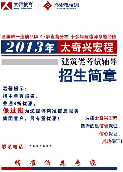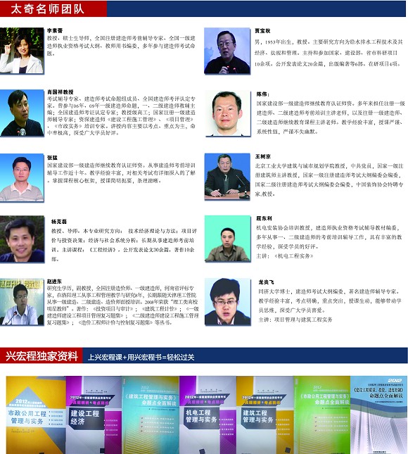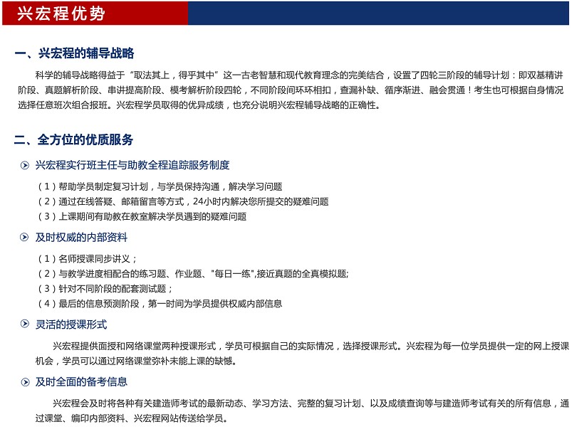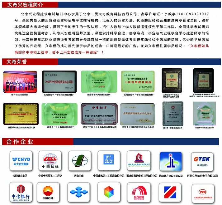 北京兴宏程建筑考试培训中心隶属于北京三民太奇教育科技有限公司,办学许可证:京教字1101087393017号,是国内最大的建筑职业资格考试辅导机构,以强大的师资力量、优质的服务和领先的过关率著称全国,占有本领域最大的市场份额,得到了各地考生的一致认可,招生人数与上线人数都遥遥领先。全国建筑考试研究院经过全面慎重考察,认为兴宏程明显师资强,课程安排科学合理,信息准确,决定与兴宏程联合举办建造师考前培训。兴宏程在建筑职业资格证书考试辅导领域首屈一指的地位是无数考生在实践检验中选择的结果,优秀的学员选择了优秀的兴宏程。兴宏程的成功首先源于学员的成功,口碑是最好的广告。正如兴宏程往届学员所说:“兴宏程如此高的命中率和上线率,是不上兴宏程成为一种冒险”