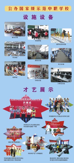 招生专业:(大部分可直升大专,也可参加高考)建筑工程施工、数控技术应用、机电技术应用、应用电子技术、计算机应用、计算机及网络家属、电子商务、高星级饭店运营与管理、旅游服务与管理、旅游服务与管理(航空服务方向)、美术(高考班)、数字艺术、学前教育、会计、汽车操作技术、服装设计与工艺