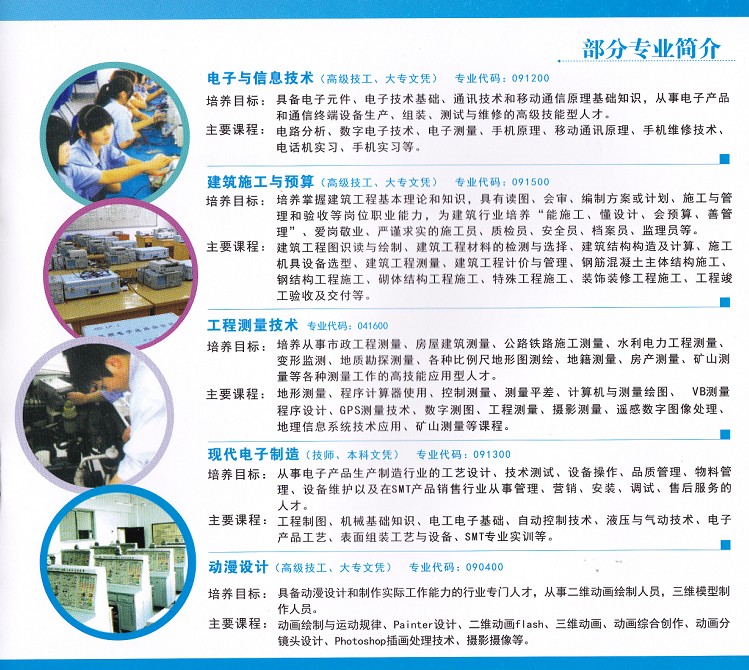 高级技工专业(大专文凭):汽车制造与维修、动漫设计、计算机应用技术、建筑施工与预算、数控机床加工、模具设计与制造、电子与信息技术