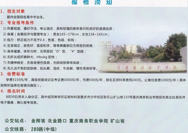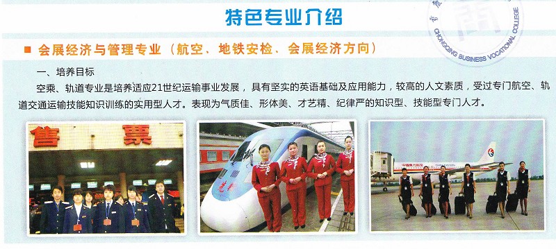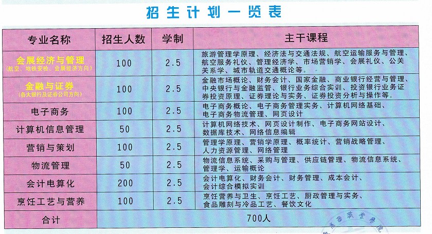 招生专业:会展经济与管理(航空、地铁安检、会展经济方向)金融与证券(各大银行及证券公司方向)、电子商务、计算机信息管理、营销与策划、物流管理、会计电算化、烹饪工艺与营养