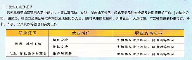培养具有运输管理综合职业能力,主要从事民航、铁路、城市地下铁路、轻轨乘务员和安全员及地勤相关工作。(为航空公司、铁路局、轨道交通集团培养乘务及地勤服务人员)
