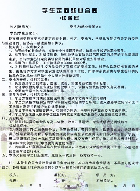专业简介:本班定向培养普列列车员、动车乘务员、高铁乘务员、客运站客运员。毕业生主要从事铁路列车工作、动车高铁工作、客运站工作。待遇好,稳定性强。