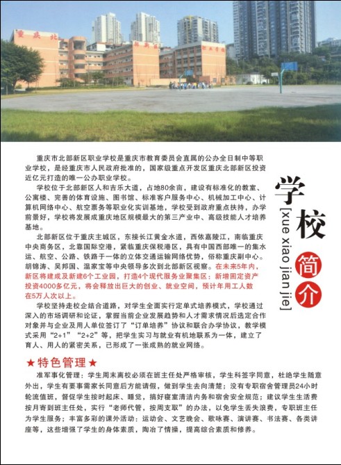 重庆北部新区职业学校是重庆是教育委员会直属的公办全日制中等职业学校,是经重庆市人民政府批准的,国家级重点开发区重庆北部新区投资近亿元打造的唯一公办职业学校。深入市场调查,掌握当前企业发展趋势和人才需求选定企业并与用人单位签订培养协议,教育模式采用“2+1”“2+2”等,把学生实习与就业有机联系为一体,建立育人、用人的紧密关系。