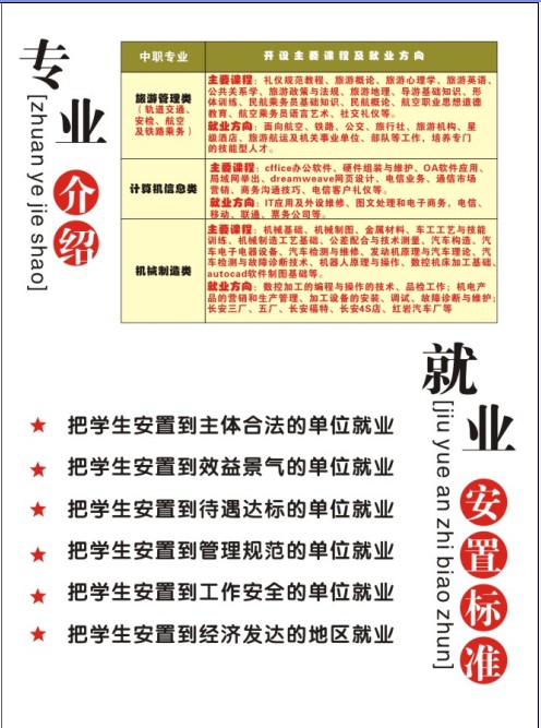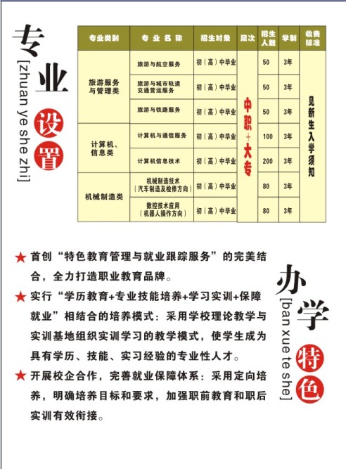 主要中专招生专业:汽车检测与维修、会展服务于管理、数控技术、动漫设计; 大专:民航商务、财务管理、建筑工程管理、城市轨道交通运营管理、学前教育