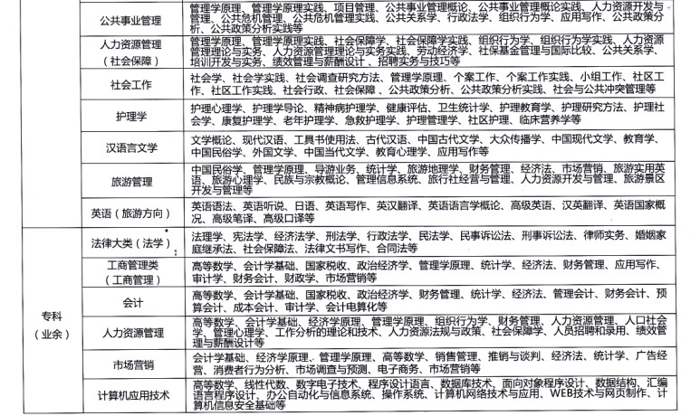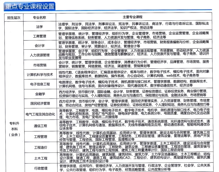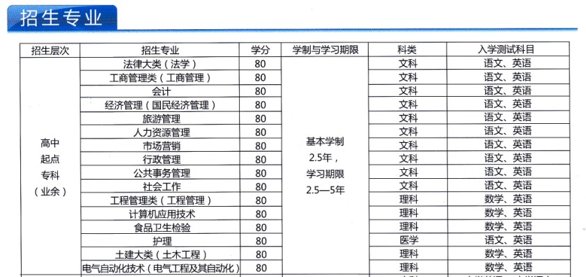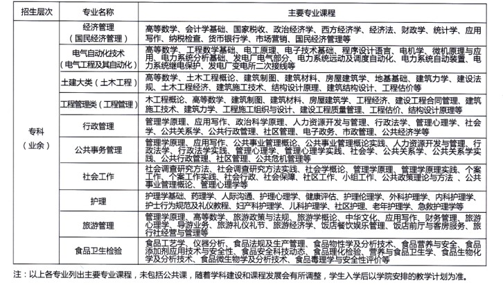 专科招生专业:法学、工商管理、会计、经济管理、旅游管理、人力资源、市场营销、行政管理、公共事务管理、社会工作、工程管理、计算机应用技术、食品卫生检验、土木工程、电气自动化