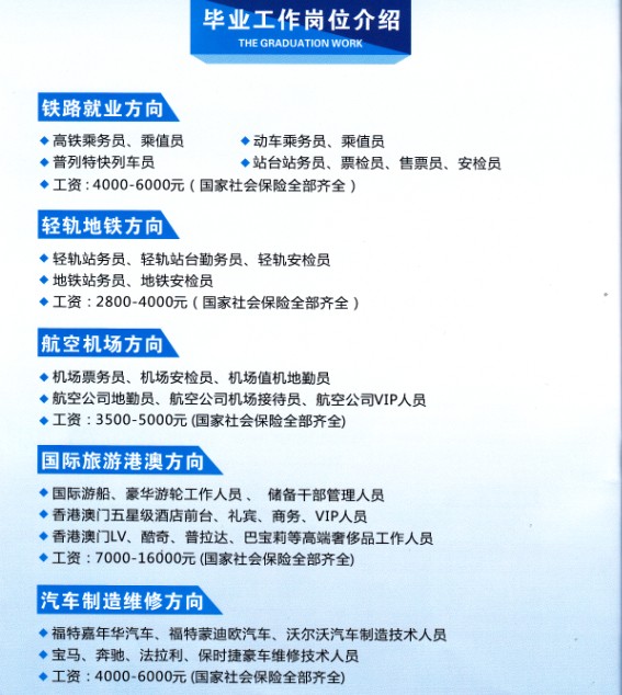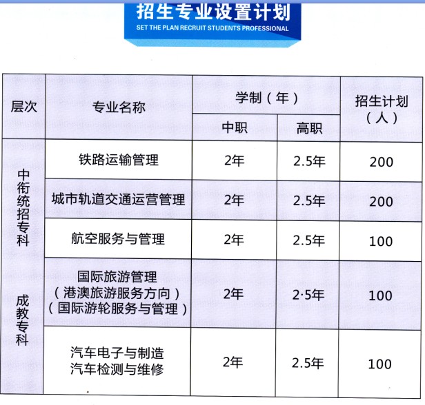 城市轨道交通运营管理专业、铁路运输管理专业、航空服务与管理专业、国际旅游管理专业(港澳旅游服务放向),(国际邮轮服务与管理方向)、汽车电子与制造专业,汽车检修与维修专业。