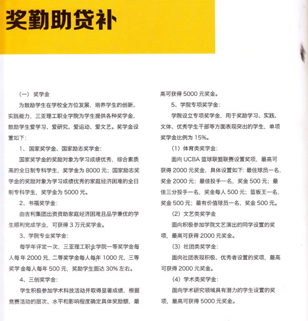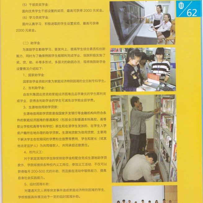 助学金:国家助学金、吉利助学金、生源地信用助学贷款、校内义工、临时困难补助。