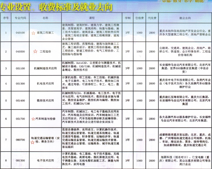 建筑工程施工、工程造价、机械制造技术应用、机电技术应用、数控技术应用、汽车制造与检修、轨道交通运输管理(安检、乘务方向)、电子技术应用、通信运营服务、电子商务、旅游服务与管理(航空海航方向)、药学、学前教育、汽车制造与检修、机电一体化