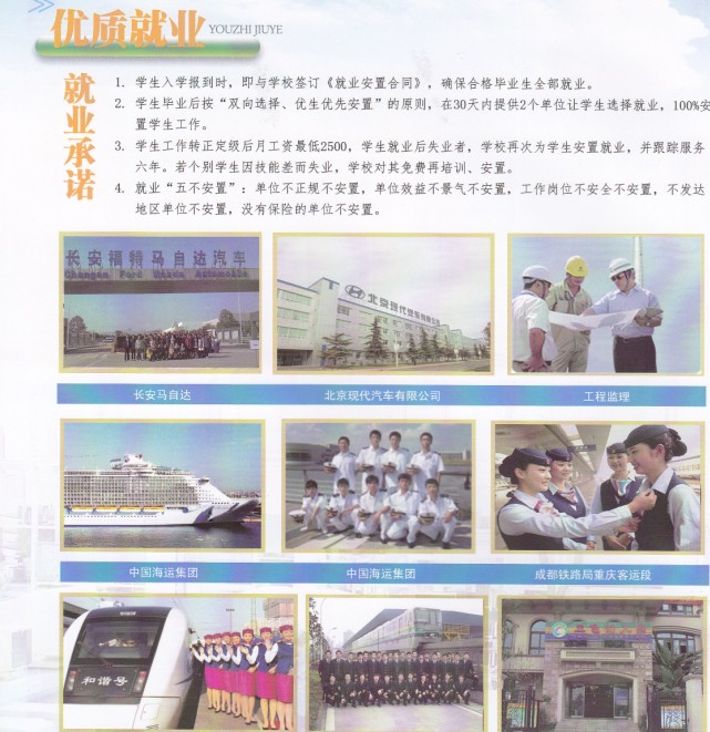1、学校入学报到时,即与学校签订《就业安置合同》,确保合格毕业生全部就业。