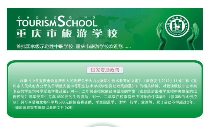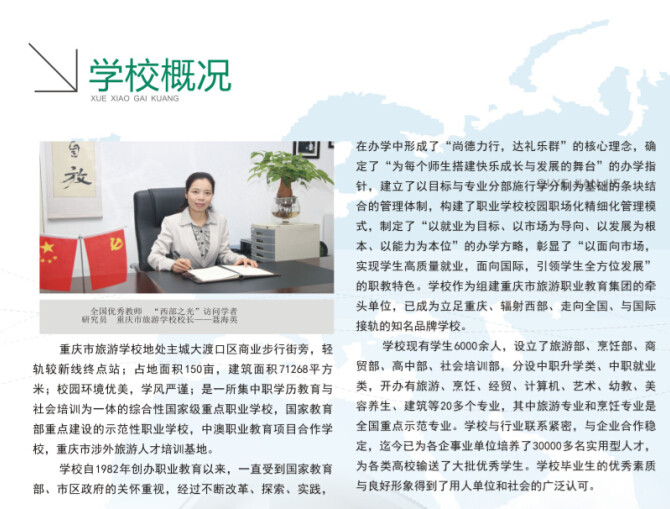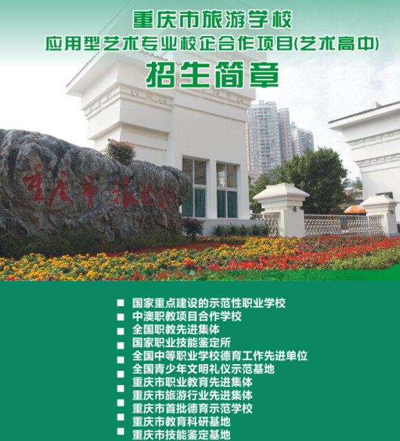 重庆市旅游学校地处主城大渡口商业步行街旁,占地面积150亩,建筑面积71268平方米,学校环境优美,学风严谨,是一所集中职学历教育与社会培训为一体的综合性国家级重点职业学校,国家教育部重点建设的示范性职业学校,中澳职业教育项目合作学校,重庆市涉外旅游人才培训基地。学校作为组建重庆市旅游职业教育集团的牵头单位,已成为立足重庆,辐射西部,走向全国,与国际接轨的知名品牌学校。