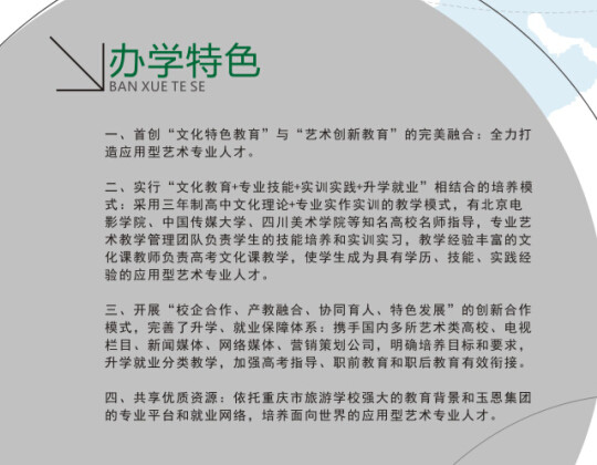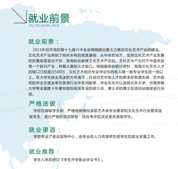 升学方向:播音主持、影视表演、影视特效化妆、航空模特、广编电视编导、摄影摄像、影视制作