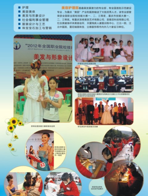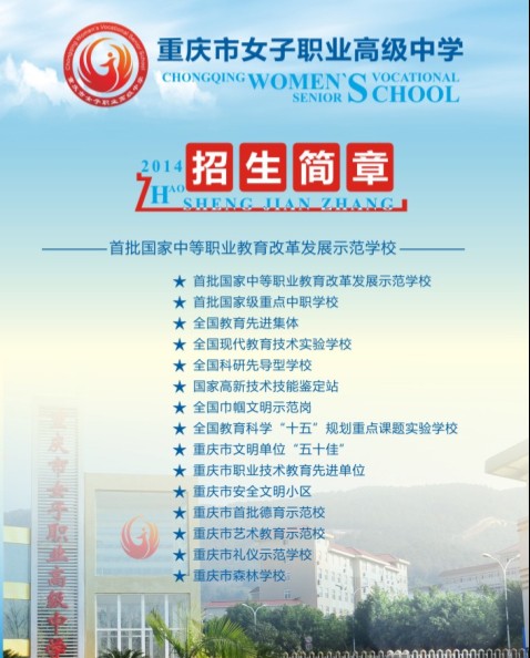 重庆市女子职业高级中学创建于1909年,建国后为重庆市第三十六中学,1981年兴办职业教育,是重庆市唯一一所专门对女性进行学历教育和职业培训的中职学校,首批国家中等职业教育改革发展示范学校,首批国家级重点中职学校。学校被教育部评为全国教育先进集体,是首批全国现代教育技术试验学校,全国教育科学“十五”重点课题,职业技术教育教学改革研究试验基地、全国科研先导型学校、全国中等职业学校学生健康教育试验学校、全国绿色学校、全国巾帼文明岗、重庆市艺术教育示范学校、重庆市文明单位五十佳、市容整洁单位等。