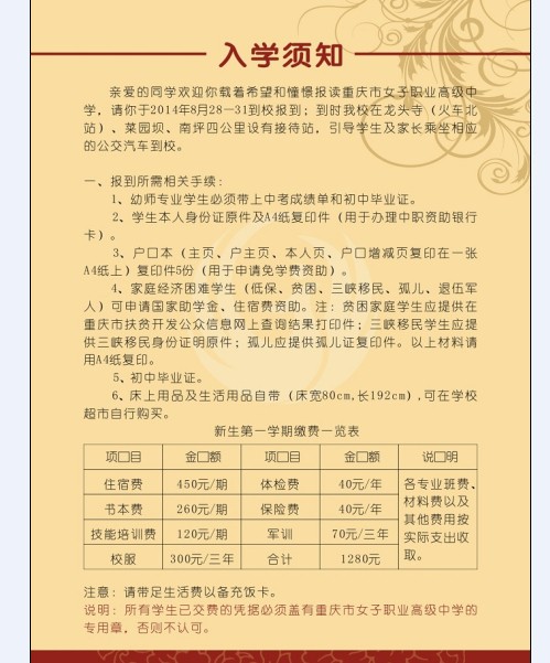 中专:市内、市外应往届初中毕业14-20岁女学生。学前教育专业必须是重庆市2013级初中应届毕业生且考试成绩达市教委统一录取的分数线以上。