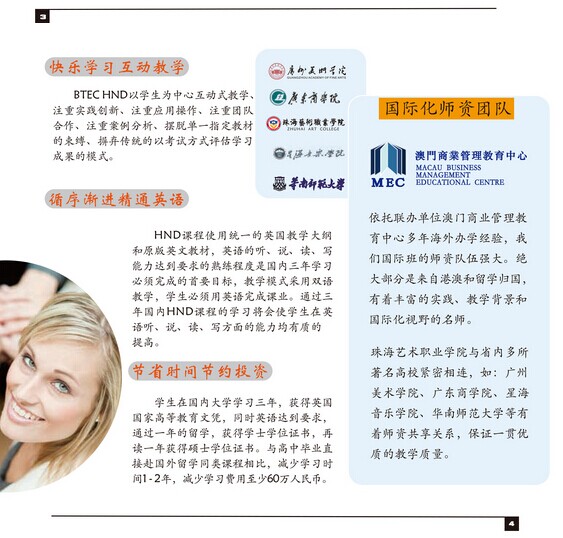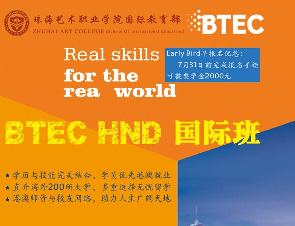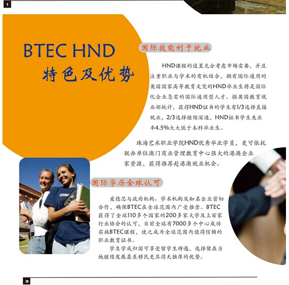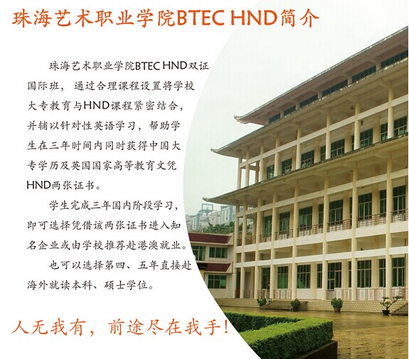 珠海艺术职业学院BTECHND双证国际班,通过合理课程设置将学校大专教育与HND课程紧密结合,并辅以针对性英语学习,帮助学生在三年时间内同时获得中国大专学历及英国国家高等教育文凭HND两张证书。