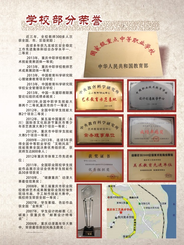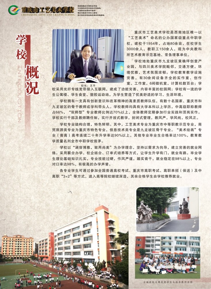 重庆市工艺美术学校是一所公办学校,与四川美术学院毗邻。1982年后根据社会发展需要由一所高完中改办为中等职业学校,因其鲜明的艺术教育特色而被市教委命名为重庆市工艺美术学校。1989年被评为重庆市首批重点中等职业学校,2003年再次被确定为省(市)级重点中等职业徐晓,2008年被确认为国家级重点中等职业学校。