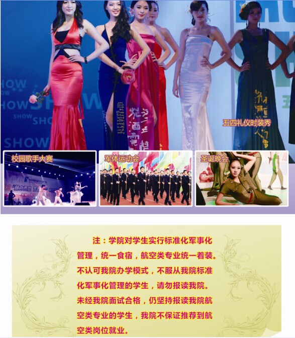 1、身高:男、女生身高要求分别在170cm和160cm以上;(空中乘务专业男、女要求分别在174cm和163cm以上,航空机电设备维修专业男生身高165cm至180cm)