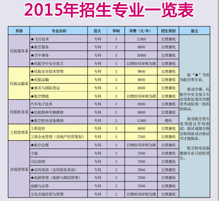 注:1、报读空乘专业须通过重庆考试院组织的面试且合格;