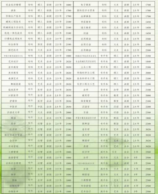 专升本:临床医学、口腔医学、护理学、中医学、汉语言文学、英语、药学、经济学、国际经济与贸易、会计学、市场营销、工商管理、旅游管理、农林经济管理、农学、林学、园林、动物科学、动物医学、表演、舞蹈学、美术学、音乐学、朝鲜语、中国少数民族语言文学、日语、汉语言、体育教育、教育学、法学、化学工程与工艺、食品科学与工程、环境科学与工程、土木工程、农业机械化及其自动化、机械设计制造及其自动化。