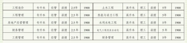 专升本:测绘工程、给水排水工程、热能与动力工程、电气工程及其自动化、水利水电工程、水文与水资源工程、建筑学、土木工程、建筑环境与设备工程、勘查技术与工程、资源勘查工程、机械设计制造及其自动化、电子信息工程、自动化、环境工程、应用化学、宝石及材料工艺学、计算机科学与技术、工程造价、工程管理、房地产经营管理、财务管理、工商管理