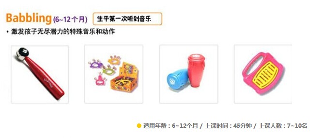 孩子13~24个月(通过音乐来表达)/上课时间:45分钟/上课人数:7~10名