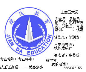 如果你们想全面学习建筑方面的知识(造价员 预算员 资料员 施工员 测量员等等)培训课程,请与我联系~~~~`,顺便提醒大家一下现在造价员考试开始在网上报名了,请大家抓紧时间报名哟,我校也开设一直受学员好评的造价员考前培训班,我们也将请专业的造价协会的老师给大家培训造价考试知识。 我们这里一直报名很火热的西南大学和北京航天大学的网教文凭,秋季报名也即将结束了!请需要的朋友尽快联系! 需要报考五大员的学员,现在也可报名参加12月份的考试! 其他:技工证,9大员年审 也请大家联系我哟!不要忘了一直关心你们的赖老师!呵呵因为你的信任,就是我的责任!电话:18323236244 qq:2402395246
