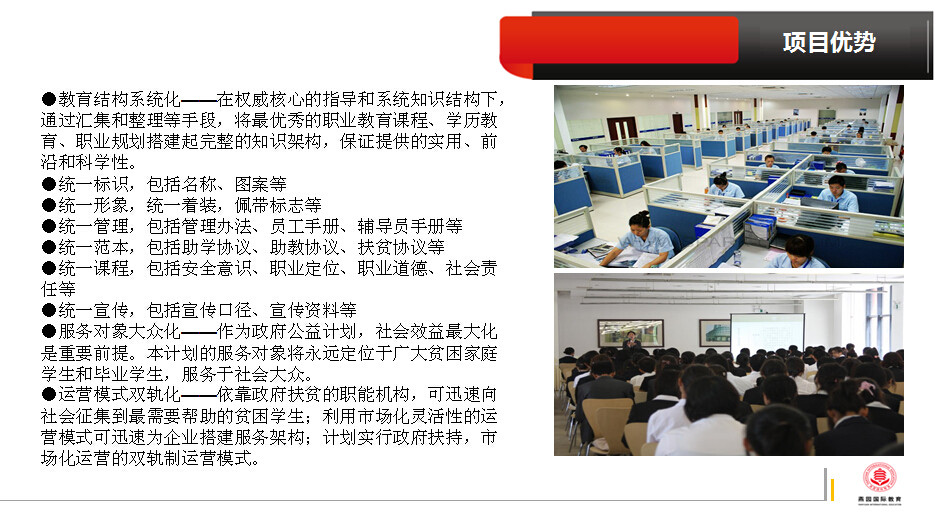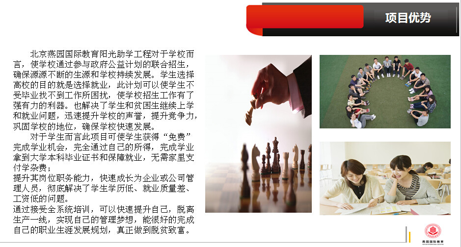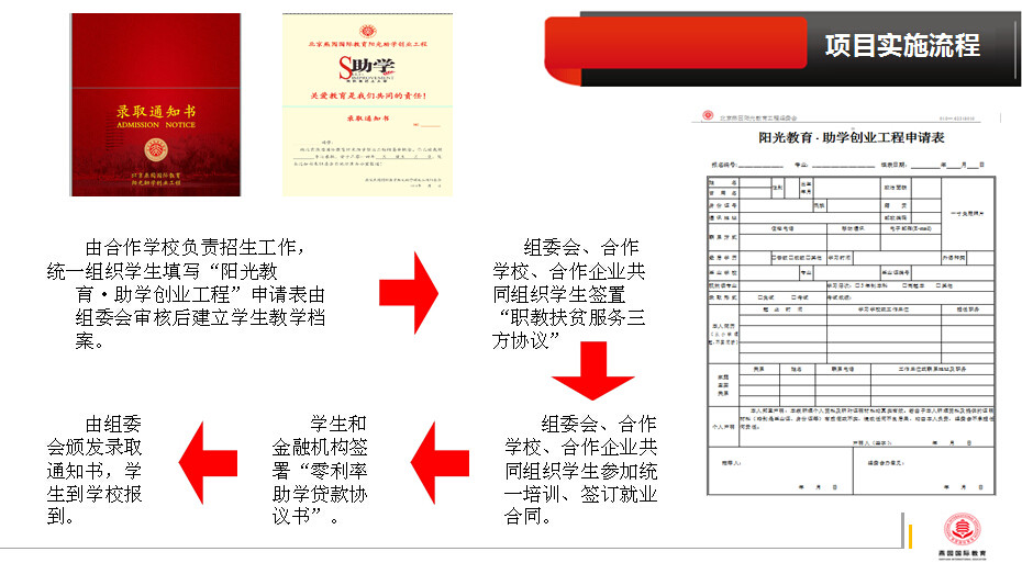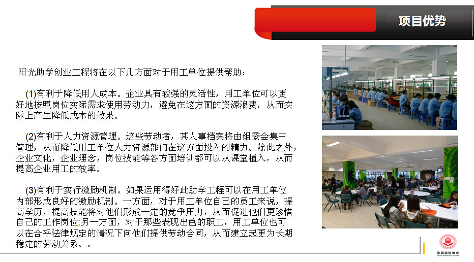 “阳光助学创业工程”从根本上帮助贫困家庭的孩子走出“贫困——脱贫——复贫”的怪圈。坚持工学结合、校企合作、半工半读、实现自主求学、保障就业的成功职教模式。