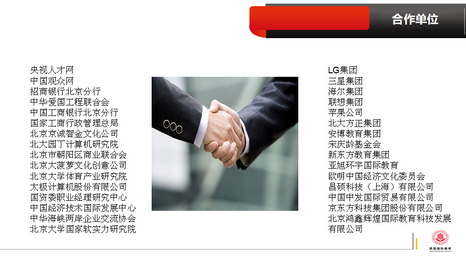 央视人才网、中国观众网、招商银行北京分行、中华爱国工程联合会、国家工商行政管理总局、LG集团、三星集团、海尔集团、苹果公司、新东方教育集团、亚旭寰宇国际教育、欧明中国经济文化委员会、中国中发国际贸易有限公司、京东方科技集团股份有限公司、北大方正集团、联想集团、北京市朝阳区商业联合会等多家知名企业。
